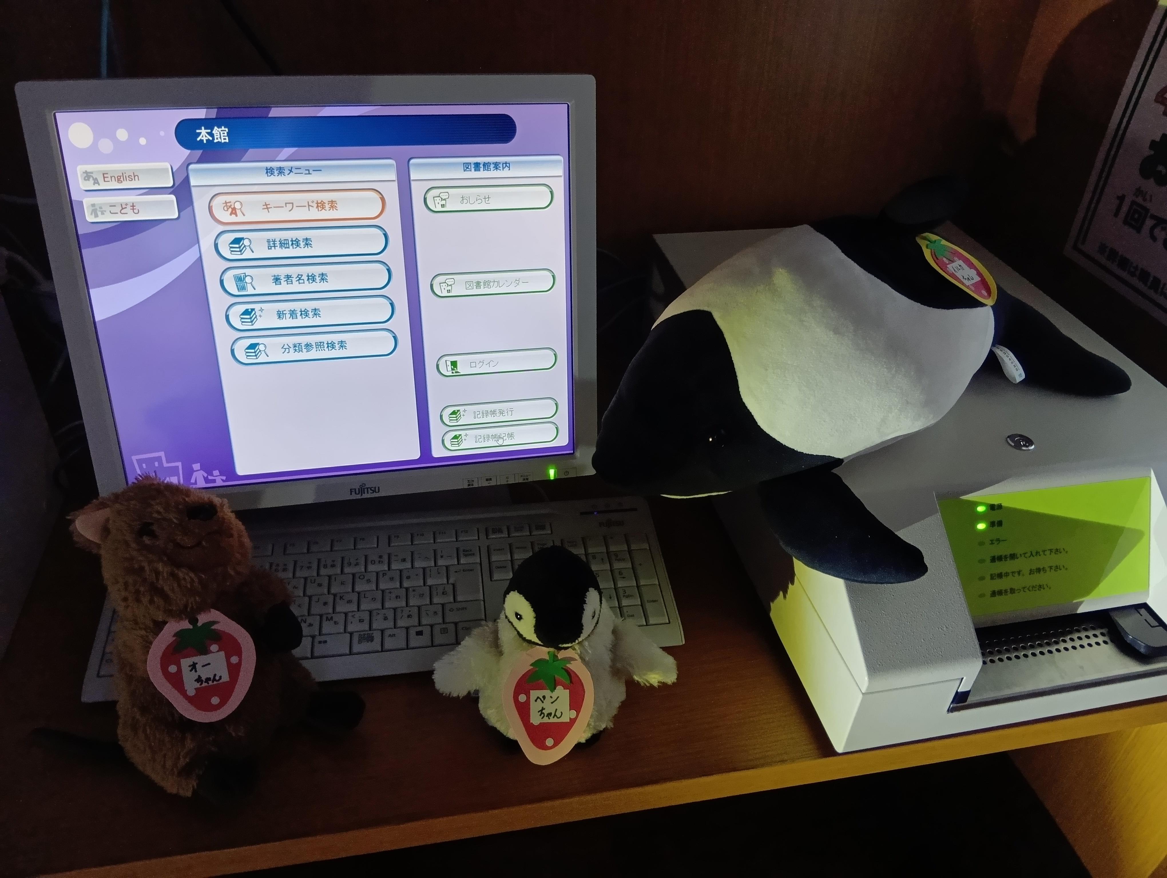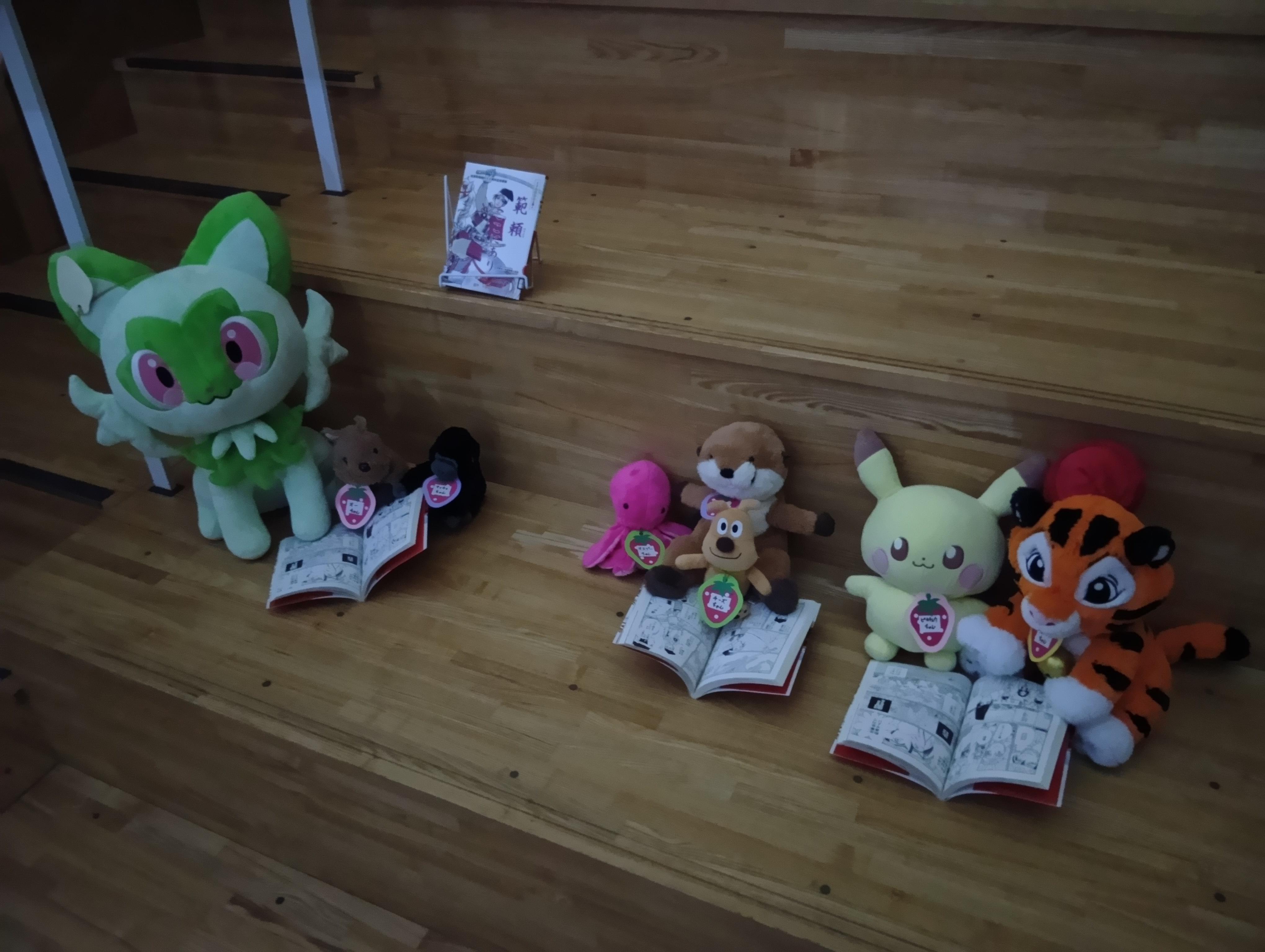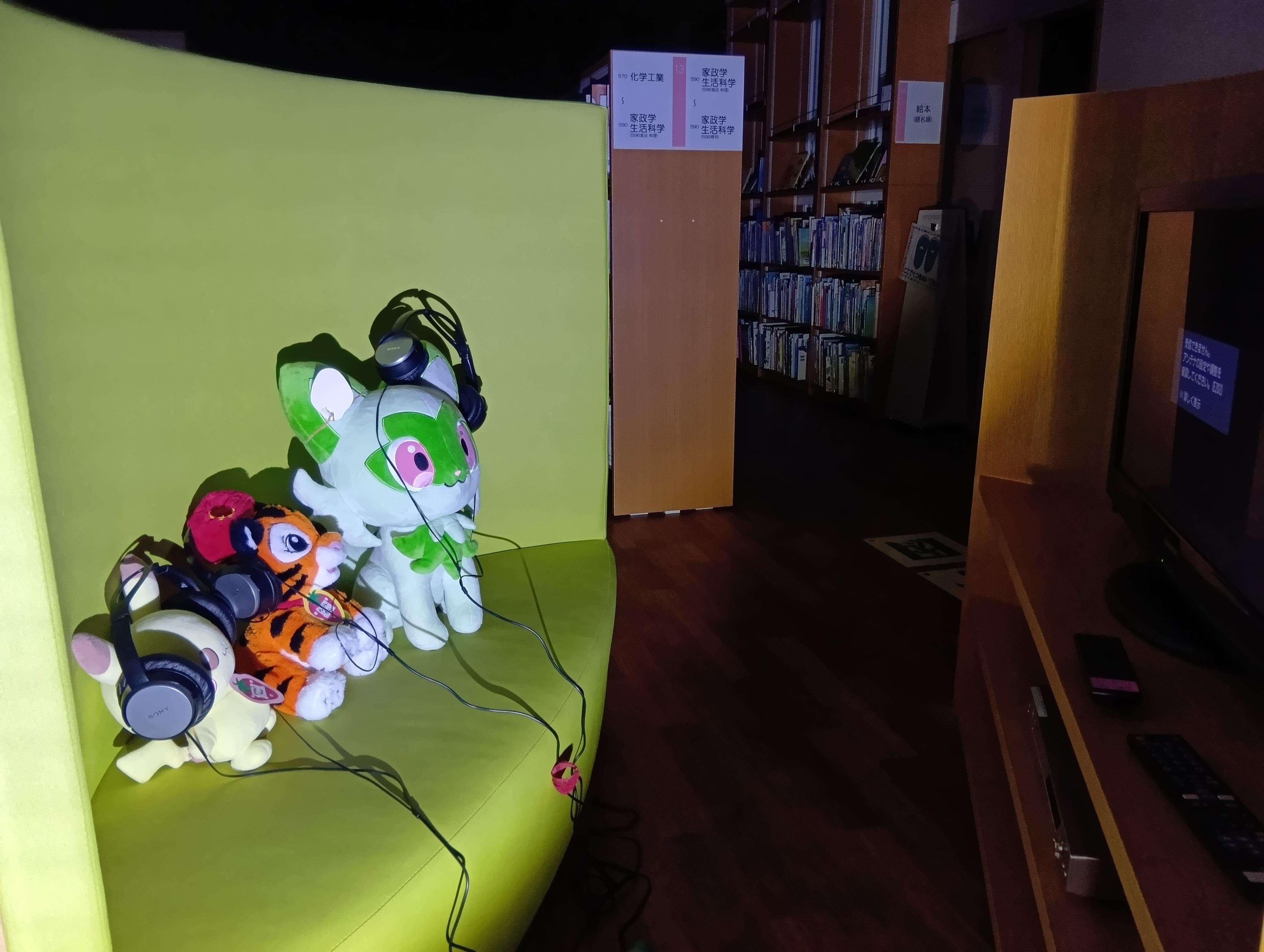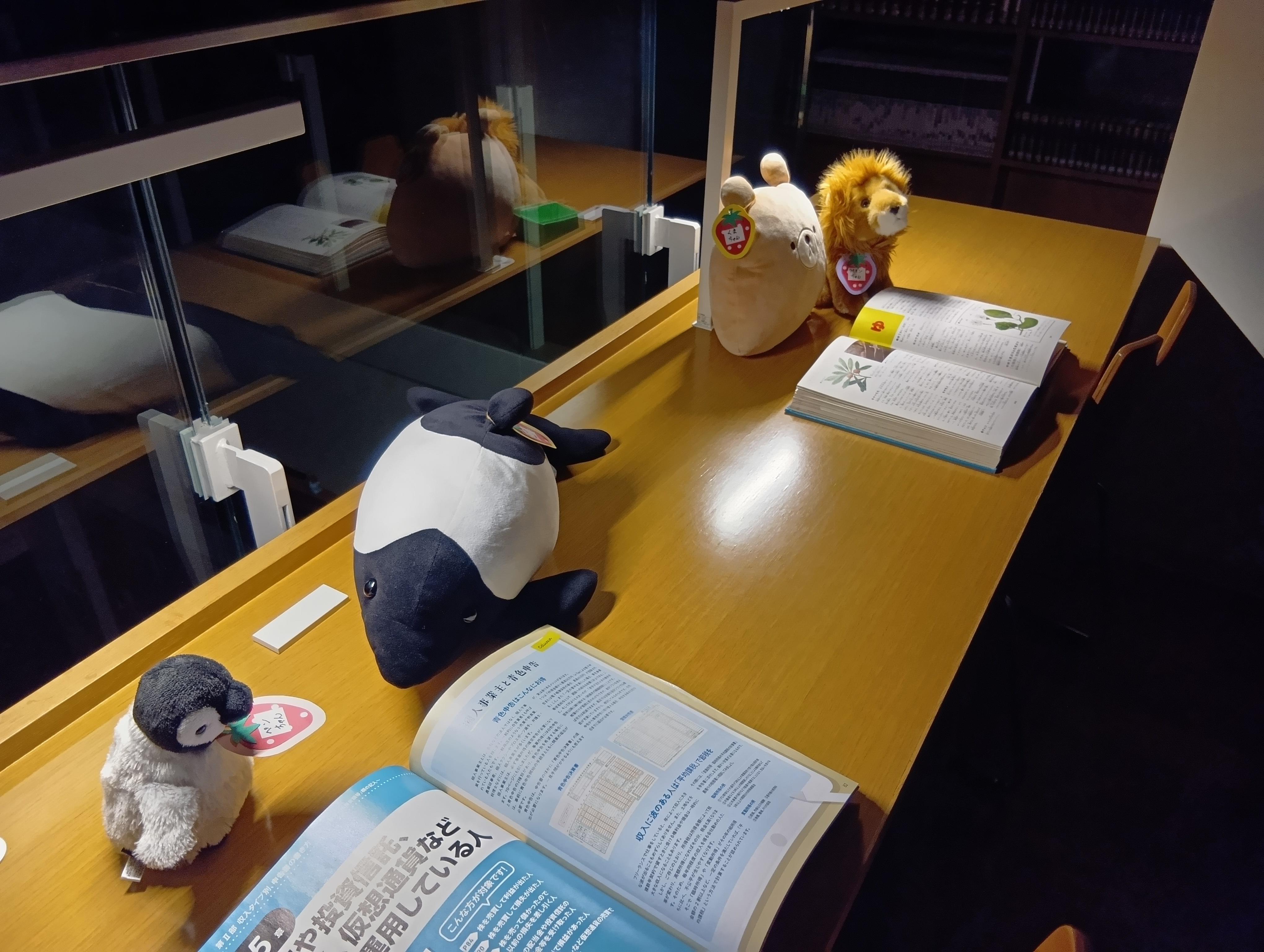【ぬいぐるみのおとまり会 その2(19時)】 ふしぎな よるとしょかん♪ ふしぎな ふしぎな よるとしょかん を ぼうけん します ここは カウンター だね つうちょう に きろく だ まんが も よめるね べんきょう しなきゃ かくだいき ってやつか DVDでも みようか ・・・つぎは20時(よる8じ)ごろです。